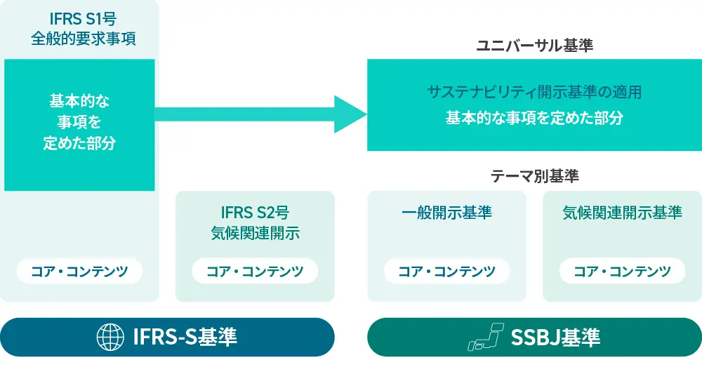 IFRS-S基準は今のところ、S1号、S2号の2つで構成されているのに対し、SSBJ基準はユニバーサル基準と2つのテーマ別基準(一般開示基準、気候関連開示基準)の3部構成になっている。IFRS S1号が、開示作成の基本的な事項を定めた部分と、サステナビリティ課題全般のリスク・機会に関して開示すべき事項(SSBJではこれを「コア・コンテンツ」と呼ぶ)を定めた構成であるところ、SSBJ基準は分かりやすさを鑑み、前半(SSBJは「ユニバーサル基準」と呼ぶ)と後半のコア・コンテンツに分離させた(図1)。