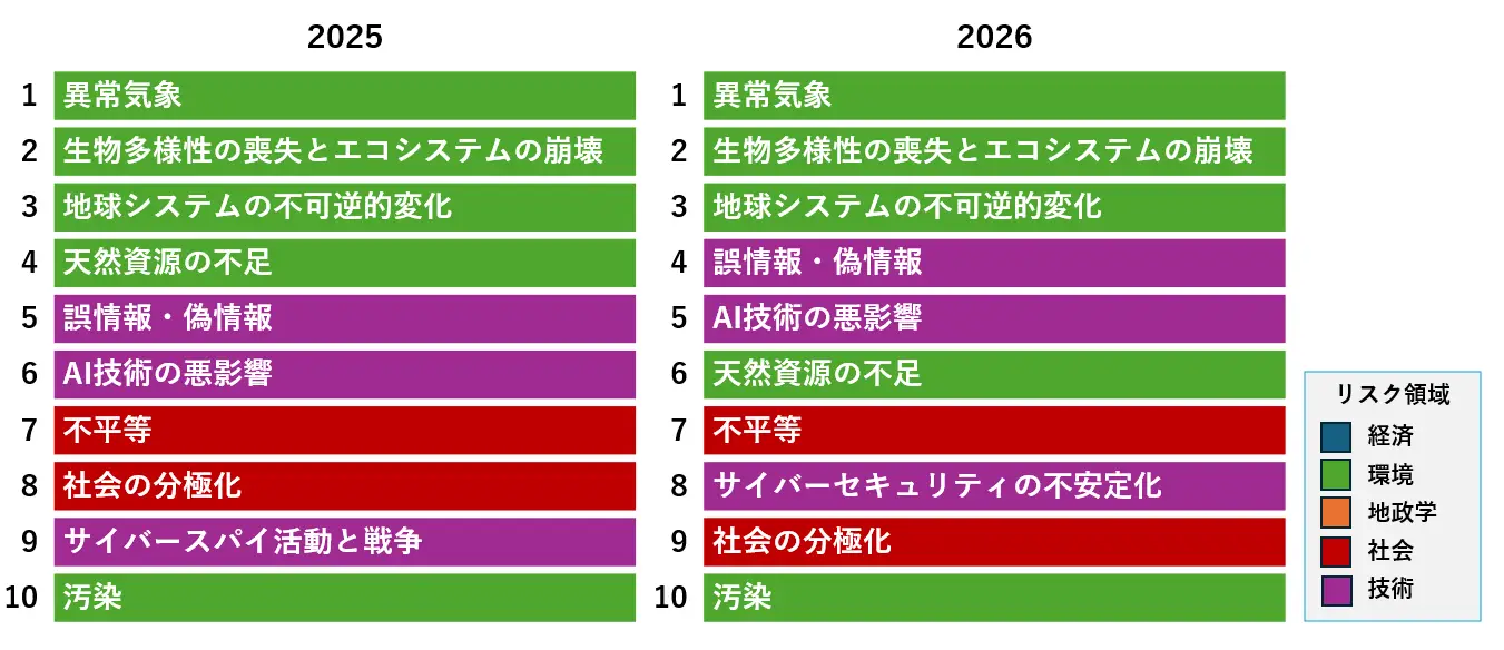 10年スパンの長期リスク上位を占めるのは、引き続き環境関連のリスクだった。「異常気象」、「生物多様性の喪失」、「地球システムの不可逆的変化」は、順位の入れ替わりこそあれ、常に最上位グループに位置している*1)。短期リスクの重心が地経学的対立や情報リスクにシフトしたのとは対照的に、気候変動は長期的には「最大の脅威」であり続けている。