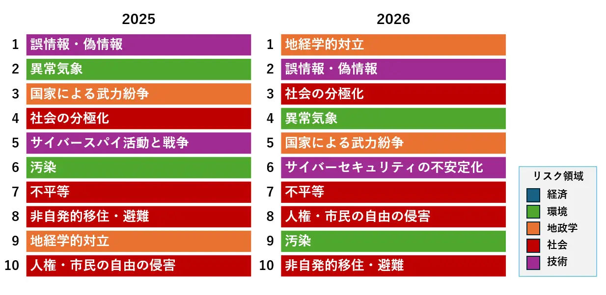 図1: グローバルリスク報告書2025, 2026年版における上位の短期(~2年)リスク