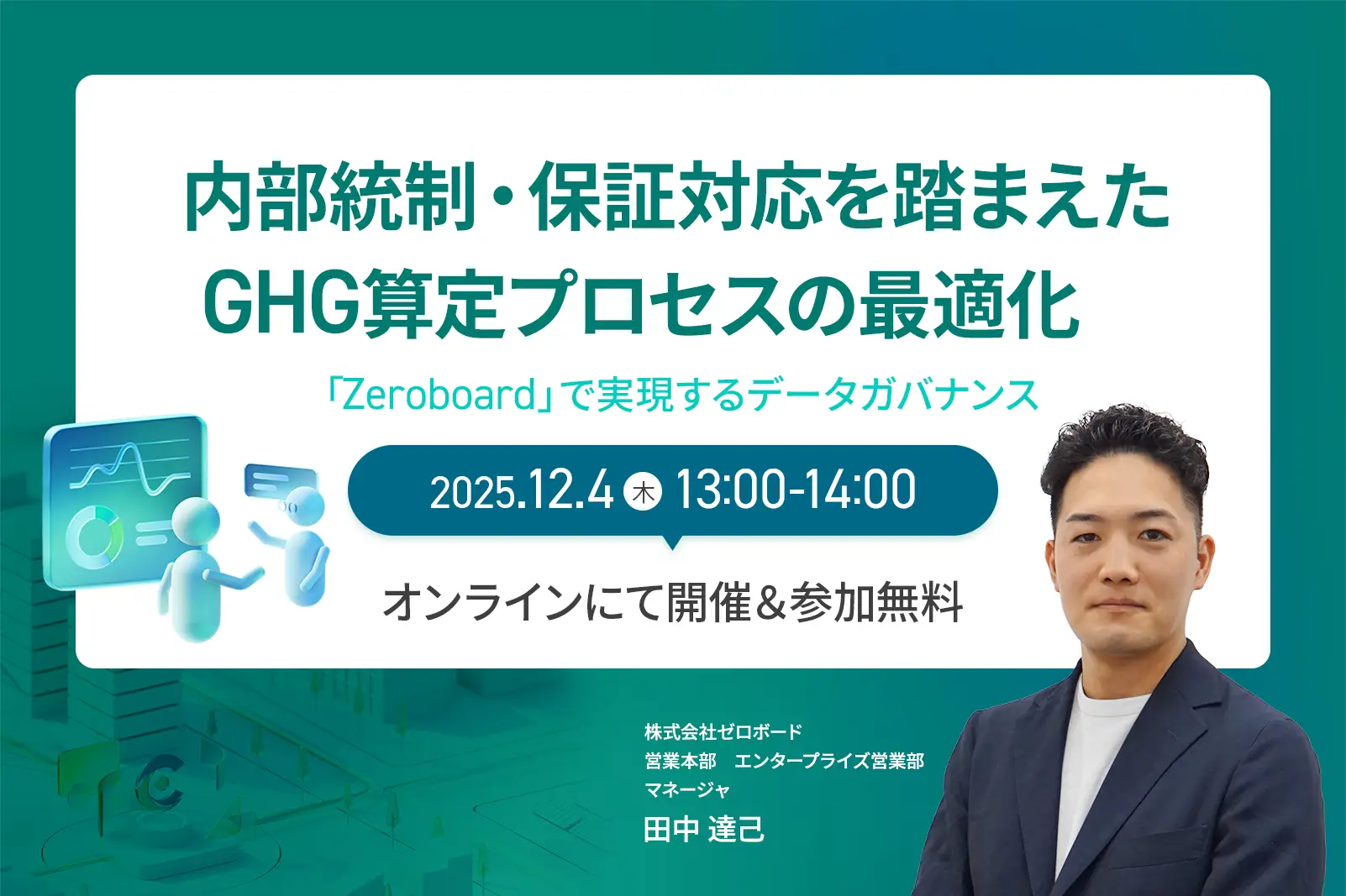 本ウェビナーでは、こうした課題を解決するための組織構造に応じたGHG算定体制の設計や業務効率化・統制強化の実践ポイントを整理します。Zeroboardを活用した具体的な運用イメージを交えながら、Excelからの脱却、内部統制・保証対応、そしてガバナンス管理までを一貫して実現するアプローチをご紹介します。