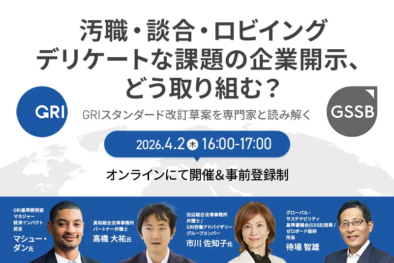 開催時間: 4.2 (木) 16:00 〜 4.2 (木) 17:00【GRI】汚職・談合・ロビイング-デリケートな課題の企業開示、どう取り組む? ~GRIスタンダード改訂草案を専門家と読み解く~