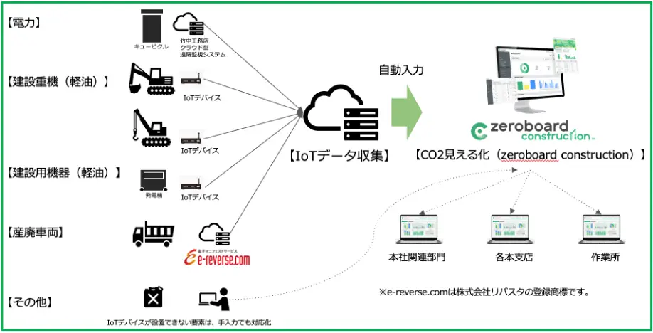 このたびの取り組みでは、IoTデバイスおよびデータ収集プラットフォームと「zeroboard construction」のデータ連携により、建設現場全体のGHG排出量を日次単位で効率的な算定・可視化、管理が可能となります。