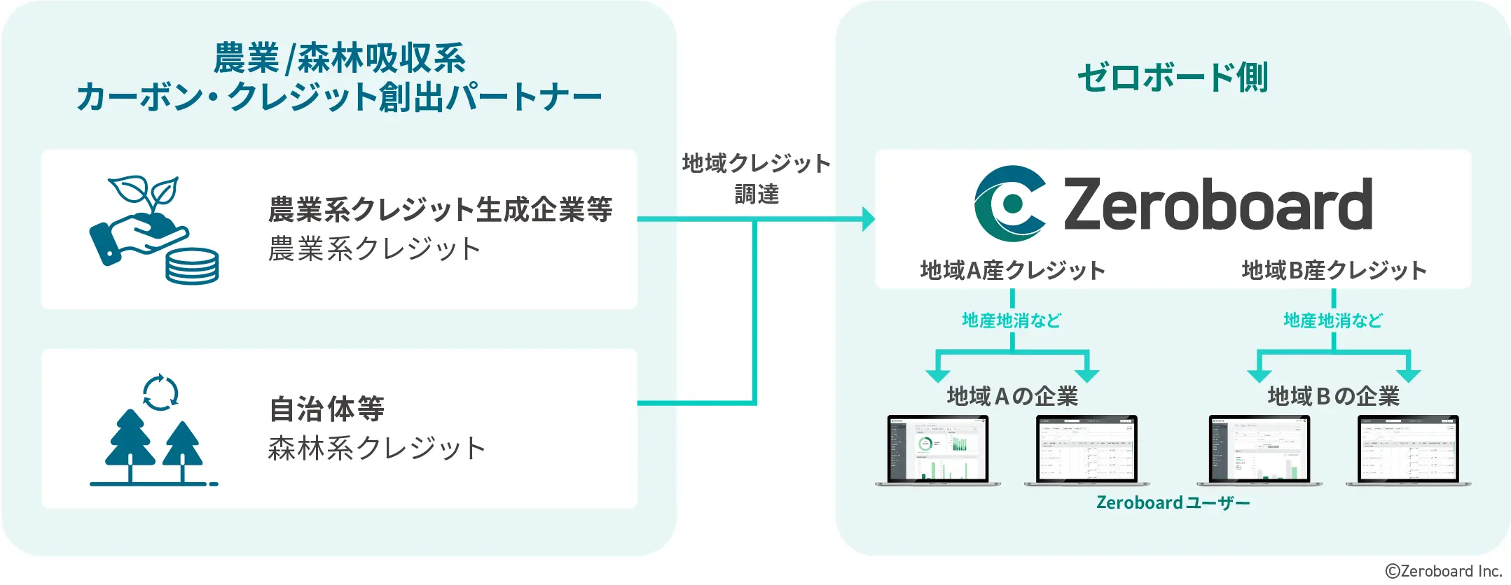 取引所で口座を開くほど頻繁な取引を想定していない企業向けに、ゼロボードが取引所等でカーボン・クレジットを調達し、提供する、あるいは代理で無効化する機能を提供します。