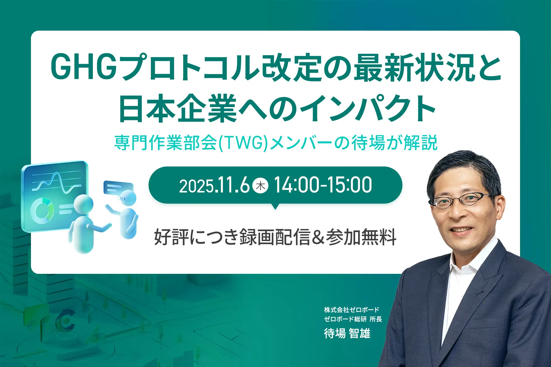 開催時間: 11.6 (木) 14:00 〜 11.6 (木) 15:00【好評につき録画配信】GHGプロトコル改定の最新状況と日本企業へのインパクト ~専門作業部会(TWG)メンバーの待場が解説~
