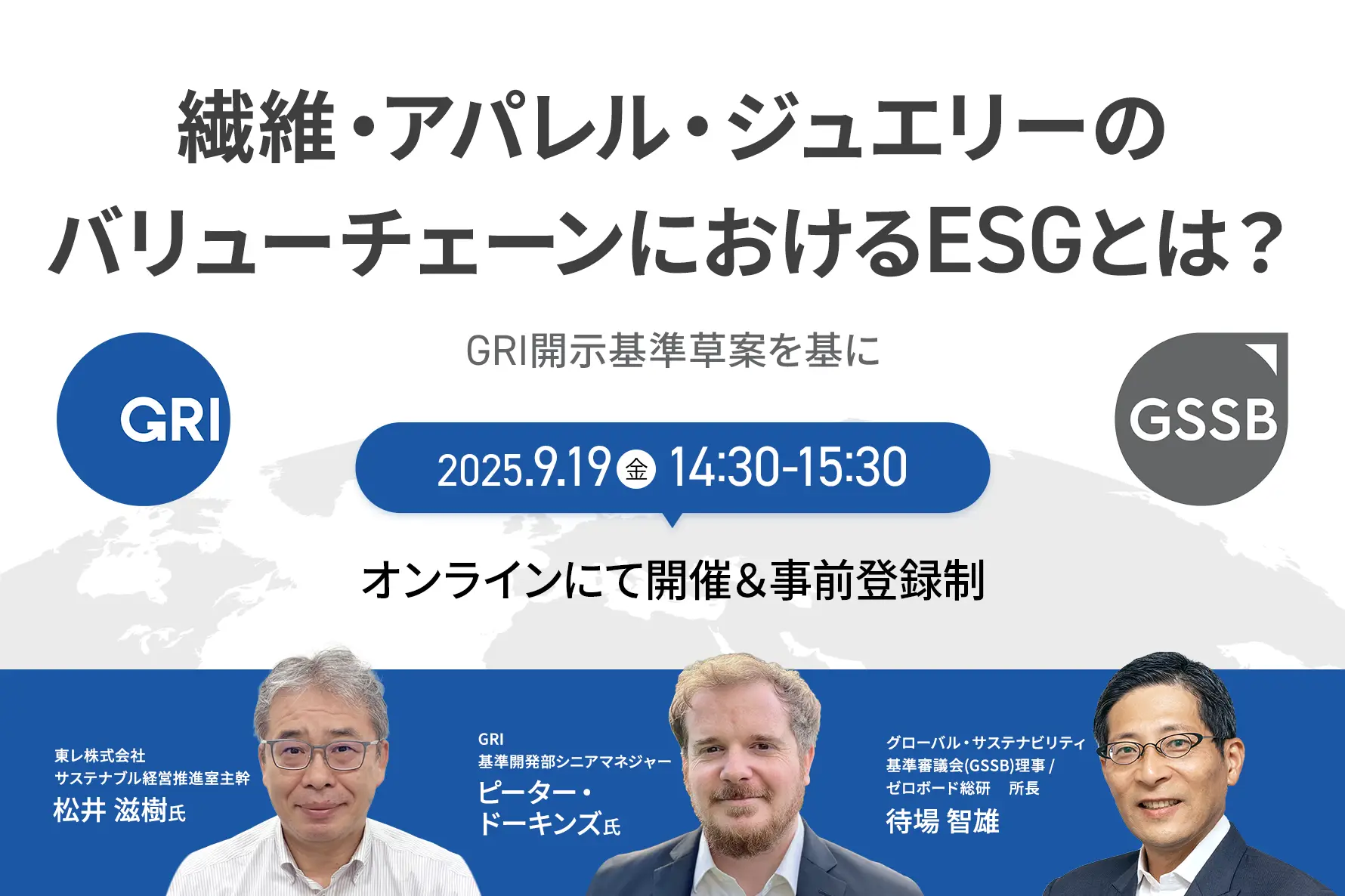 開催時間: 9.19 (金) 14:30 〜 9.19 (金) 15:30【GRI】繊維・アパレル・ジュエリーのバリューチェーンにおけるESGとは?ーGRI開示基準草案(GRIスタンダード草案)を基に