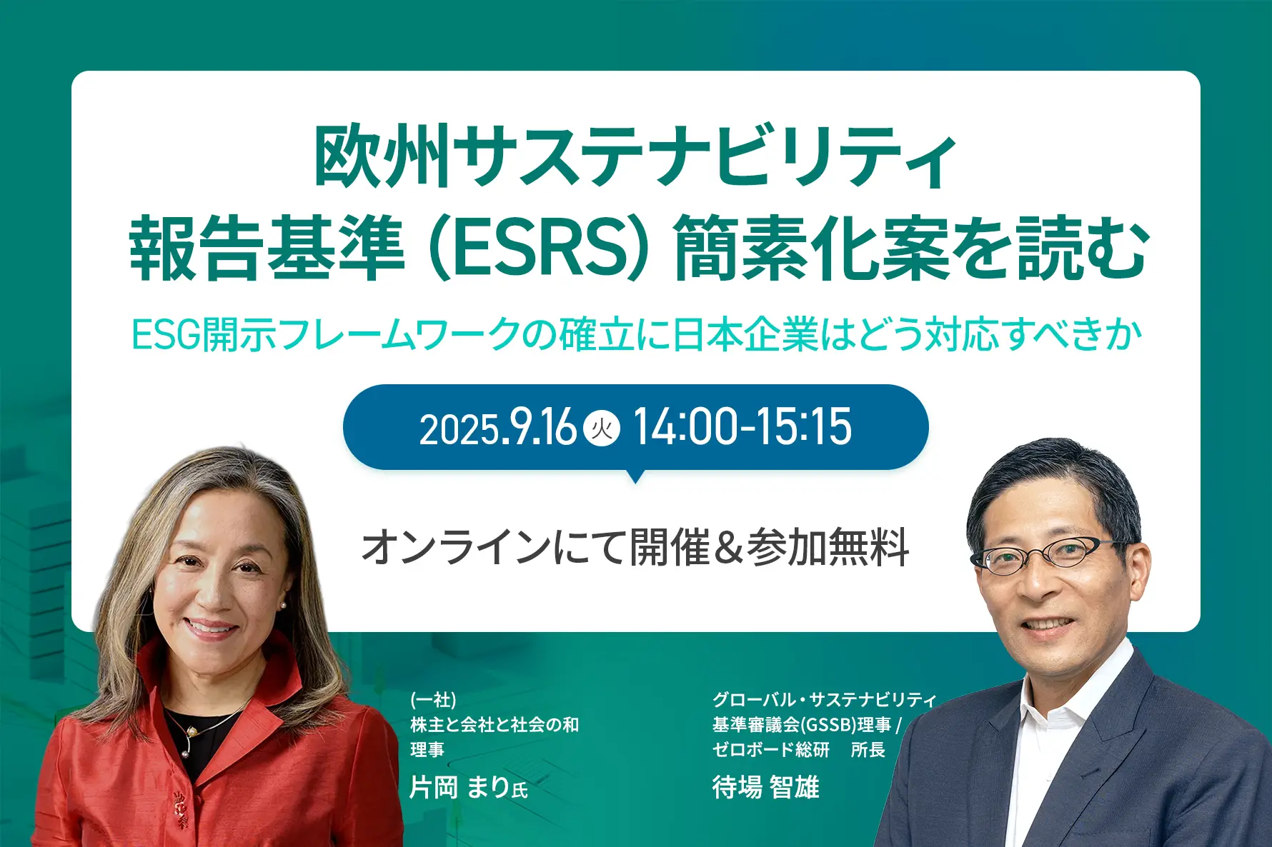 開催時間: 9.16 (火) 14:00 〜 9.16 (火) 15:15欧州サステナビリティ報告基準(ESRS)簡素化案を読む ーESG開示フレームワークの確立に日本企業はどう対応すべきか